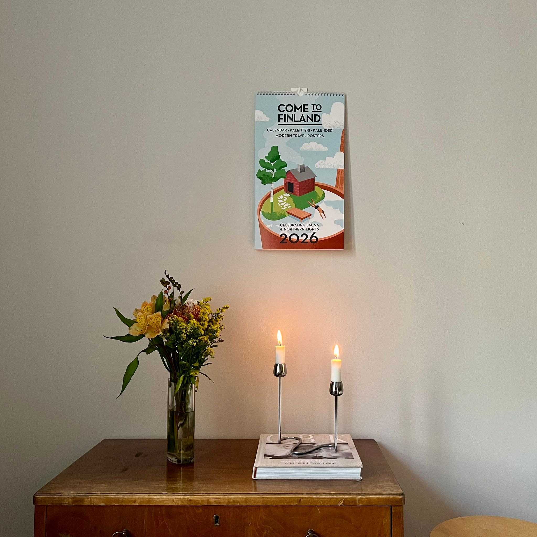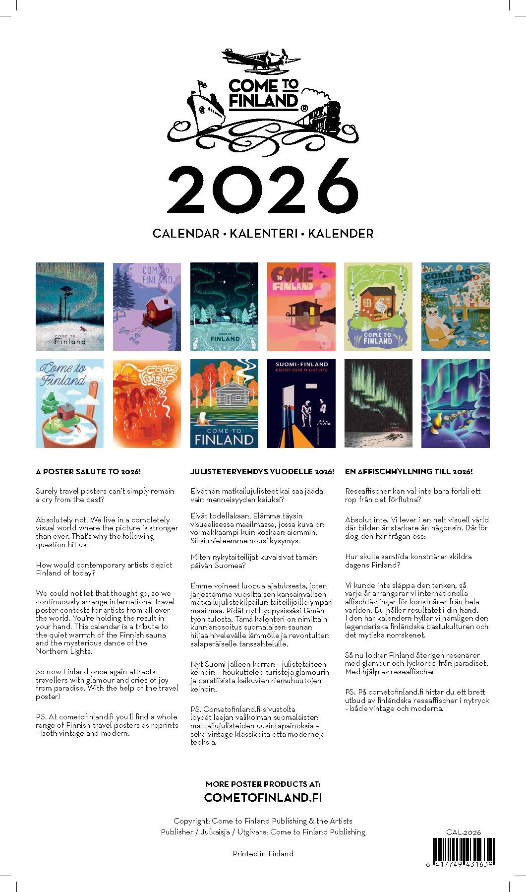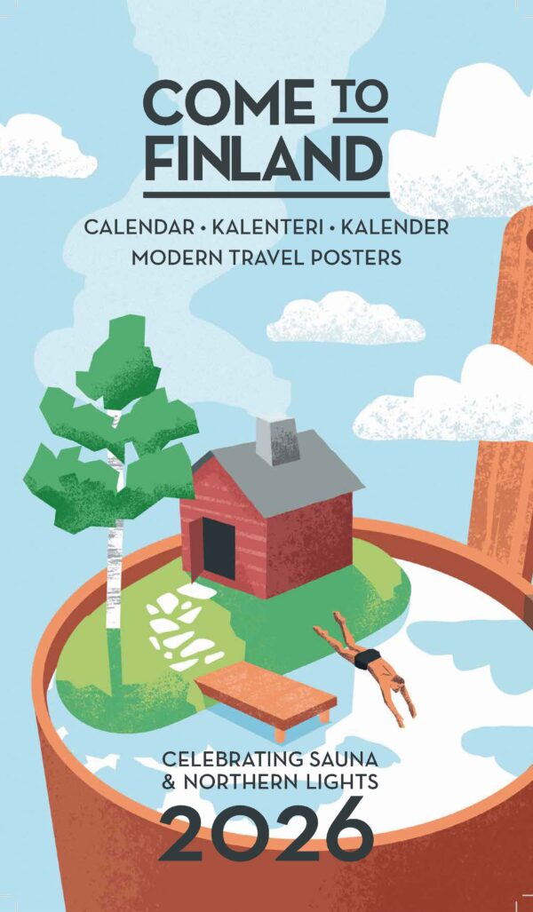 Juhli Suomea vuoden jokaisena päivänä tällä ainutlaatuisella kunnianosoituksella revontulille ja saunalle. Jokainen kuukausi esittelee upean modernin matkailujulisteen, jonka ovat luoneet suosikkitaiteilijamme.
